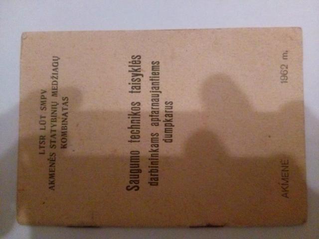 Knygelė: Akmenės statybinių medžiagų kombinatas "Saugumo technikos taisyklės darbininkams aptarnaujantiems dumpkarus" 1962m leidimo.