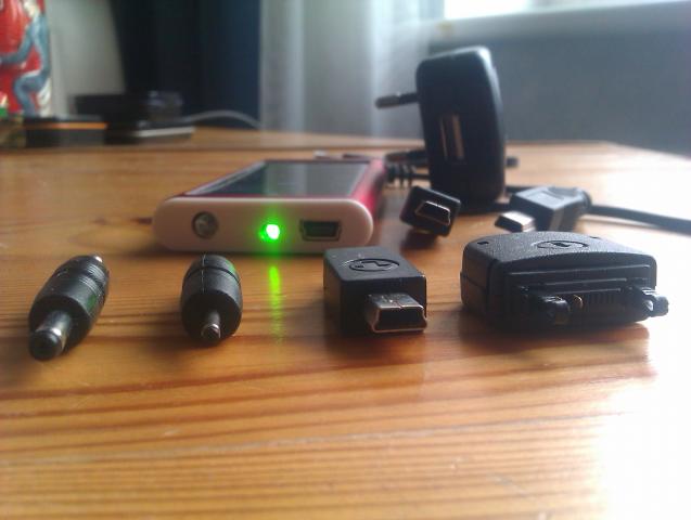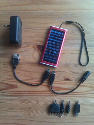 "Ežio" pakrovėjas su saulės elementu. Nebandžiau, ar krauna, bet dienos šviesoje užsidega lemputė (žr. nuotrauką), tai viskas turėtų būti gerai. Yra plonas ir storas Nokios antgaliai, storas USB antgalis ir dar kažkoks, taip pat kištukas į rozetę.