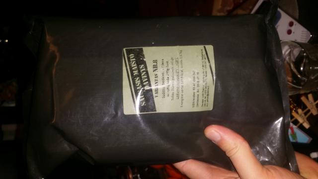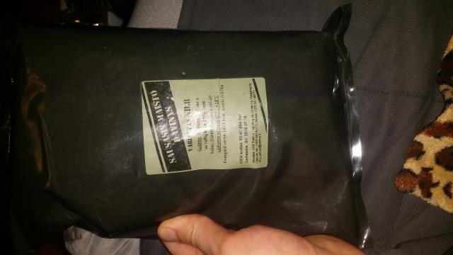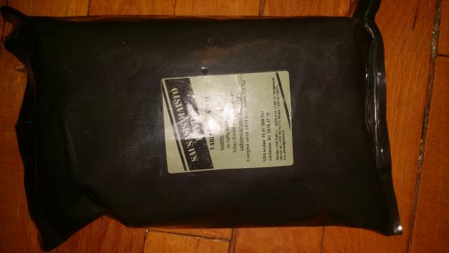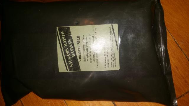 Vienoje pakuotėje yra: Mėsos konservai su garnyru 240-250 g (jautiena, vištiena arba kiauliena) Duona (traški duonelė) 90 g (4x riekelės) Riešutai 56 g (lazdyno arba migdolai) Natūralus medus arba džemas (persikų, braškių arba j. serbentų) 30 g Tirpus gėrimas su vitaminu C 30 g (apelsinų, citrinų arba vyšnių skonio) Šokoladas 35-40 g (2x juodo šokolado RŪTA plytelės) Arbata (tirpi kava, arba vištienos sultinys 10 g) Cukrus 12 g Drėkinamoji servetėlė (rankom nusivalyti) Degtukai (dėžutė)