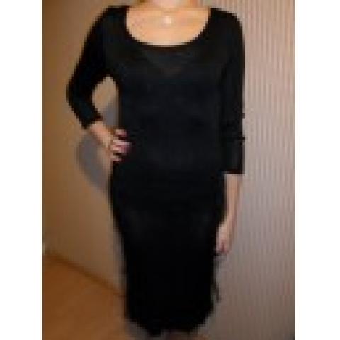 Juoda, elegantiška suknutė, puošta tos pačios medžiagos siūlais. Pagaminta "Savitam stiliuje".