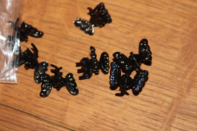 Iš viso 14 drugelio formos segtukų. 3 su mėlynom akutėm, 5 žydrom ir 6 juodom. Visi blizgučiai vietoje.