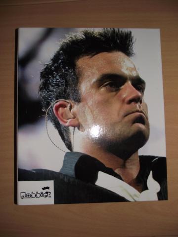 Segtuvas su Robie Williams. NUgarėlė ir viduje pakraščiai truputį pageltę. Nugarėlės plotis 4 cm, 25,5 cm x 31,5 cm