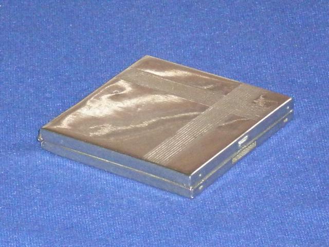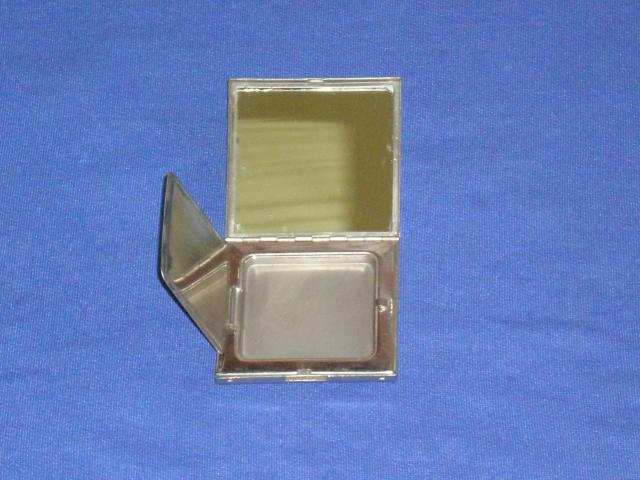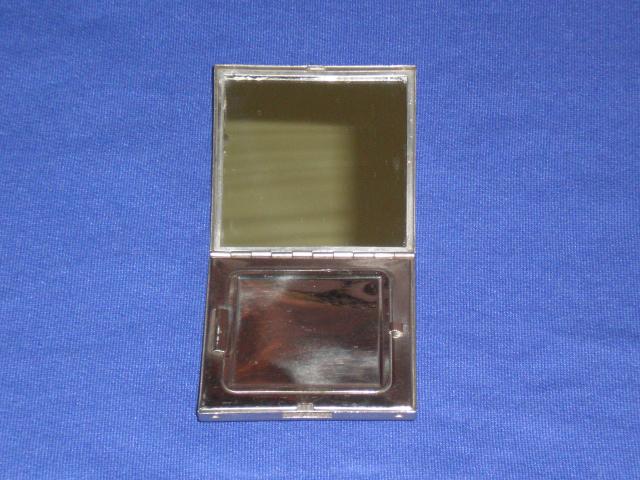 Veidrodelis idetas i metalini dekliuka. Yra ir atsidarantis ,,slaptas'' skyrelis pudrai.