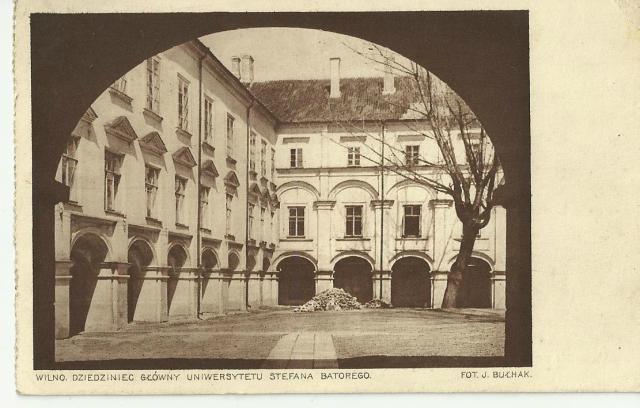 Senas atvirukas su vaizdu i Didiji Vilniaus universiteto kiemeli.