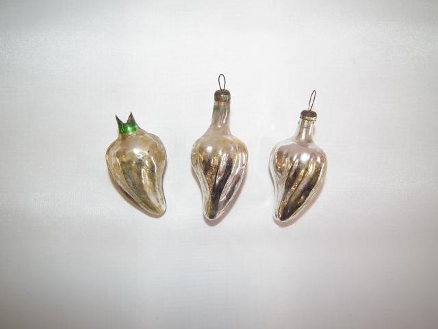 Seni eglutės žaisliukai. Vienos paprikos pakabinimo kakliukas nuskilęs.