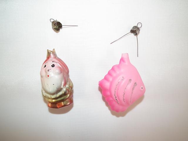 Seni eglutės žaisliukai. Prie pakabinimo abiejų žaisliukų kakleliai truputi nuskilę. Žuvis neturi uodegos.