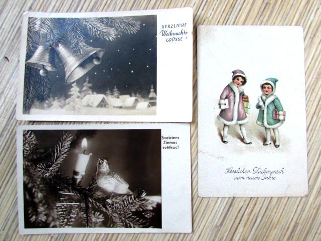 Seni naujametiniai atvirukai. Su paukšteliu prie žvakės NĖRA. Su varpeliais - vokiškas, bet užrašytas latviškai, 1949 m. Vaikai su dovanėlėmis, neužrašytas, truputį sulinkęs. Kiekvieno kaina - 2 eurai.