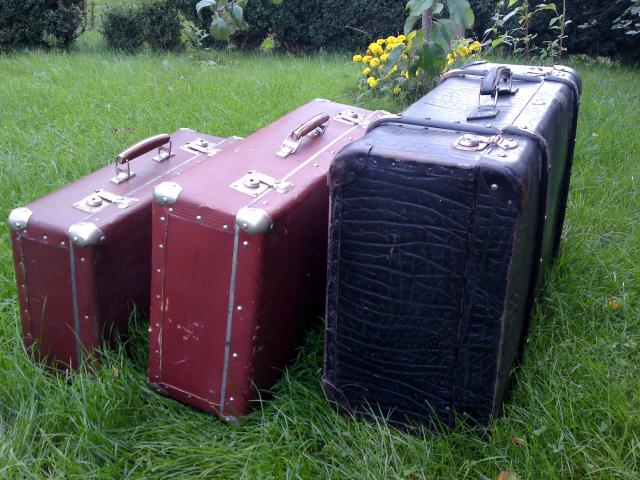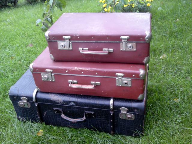 Senas vokiskas didelis, juodas lagaminas. Lagamino stovis geras, uzdarymio mechanizmai ir vyriai sveiki be apgadinimu, Kiti du lagaminai rusvos spalvos taip pat gerame stovyje.