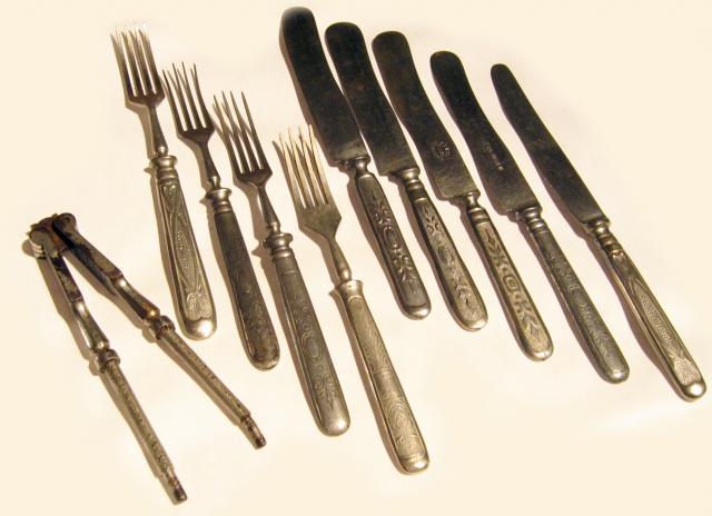 Seni stalo irankiai, sakutes, peiliai, apgadintas prietaisas riesutams skaldyt??? irankai mate gyvenimo, ivairus, viso 10 vnt., metaliniai