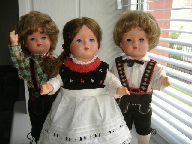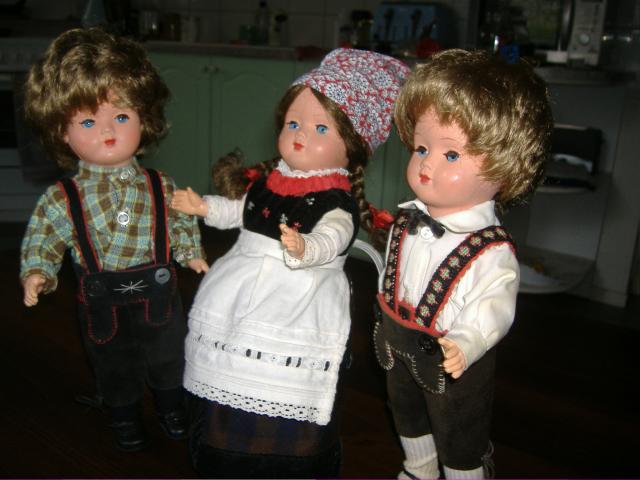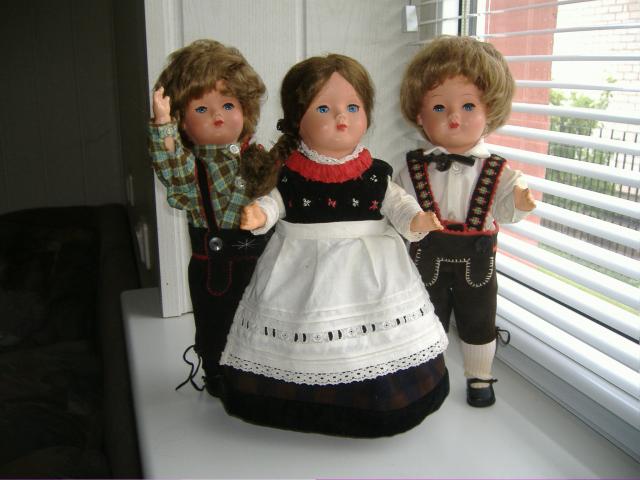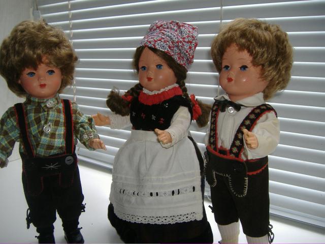 Labai gražios lėlytės. Jos visos visiškai vienodos (turiu minty kunelius) Skiriasi tik drabužiai ir šukuosenos. Apie 1960- 1965m. atvežtos iš Vokietijos. Apviktos tautiniais drabužėliais. Akys mirksi. Pačios stovi. Rankytės, kojytės ir galvytės sukiojasi. 1 vnt. kaina - 19 eurų.