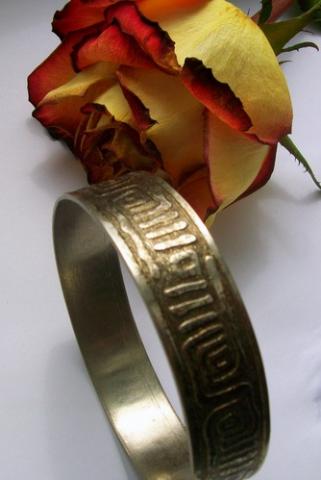 Puošta raštais, o gal rašmenimis. Metalinė.