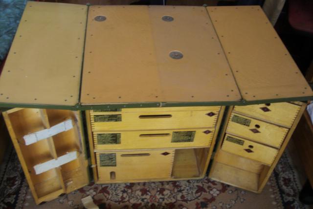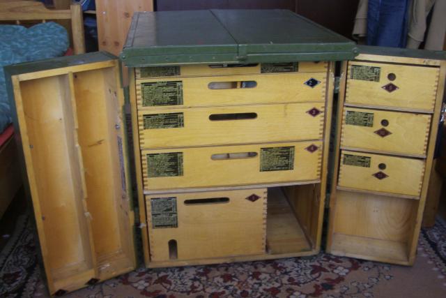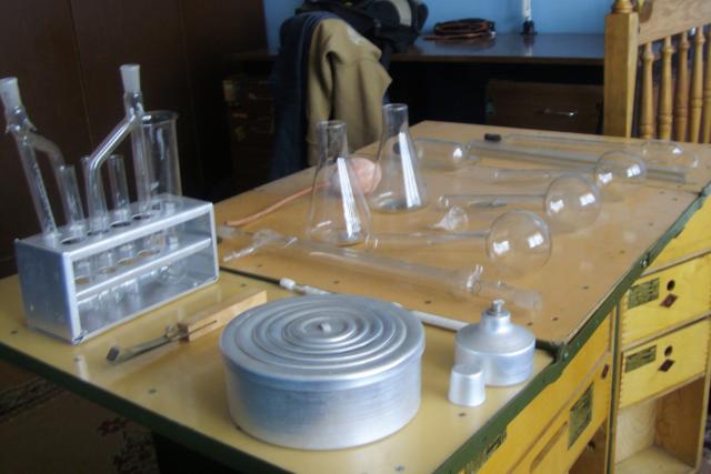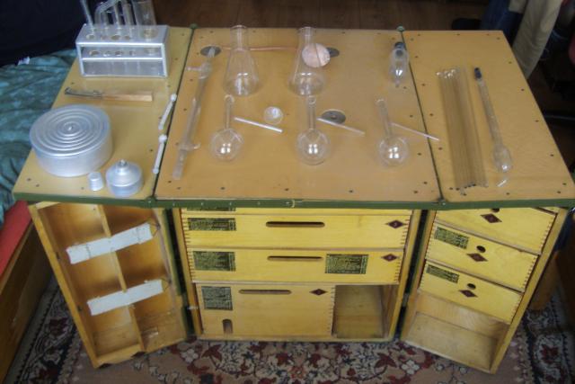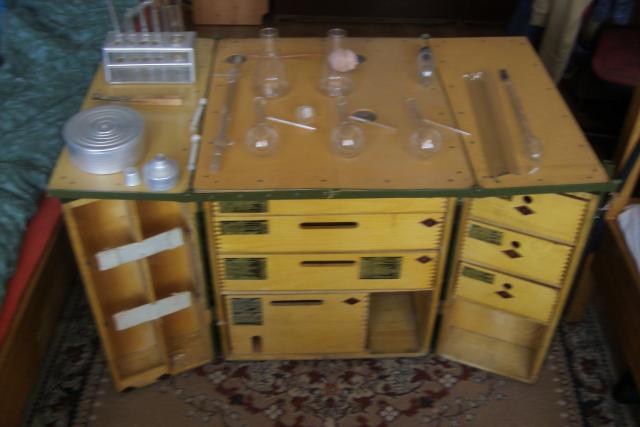 senovine chemojos deze 5 ilgi stalciai 3 mazi + ivairus stikliniai indeiai 1987 metu ant visrsaus isiskleizia stalas