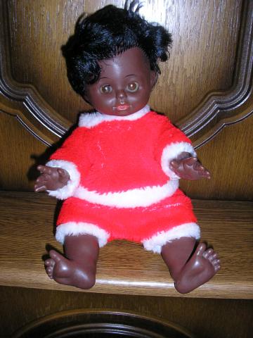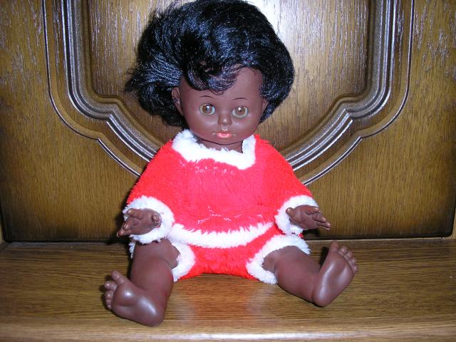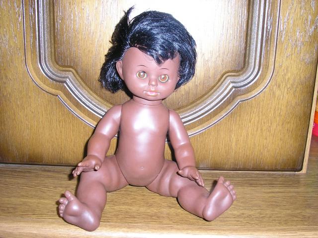 Senovine (antikvarine) grazi tamsiaode lelyte, kunelis kietas galunes ir galva is minkstesnio plastiko. Kaina uz lelyte su drabuzeliais.