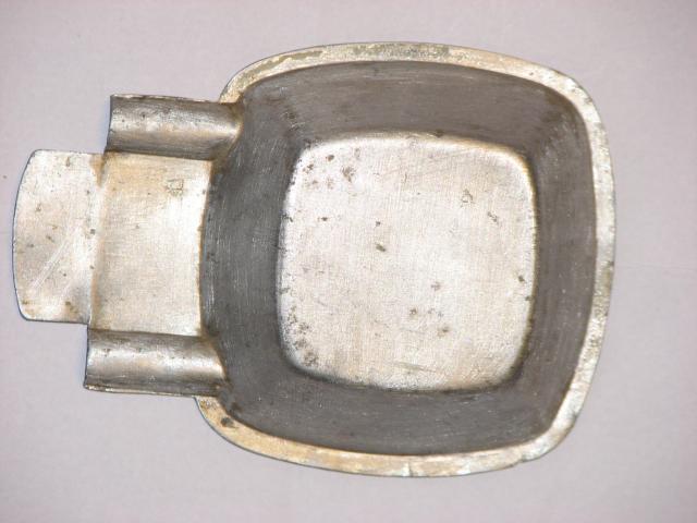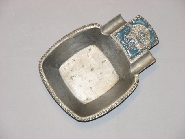 Senovinė peleninė, medžiaga aliuminis. Nušveista, nes buvo dažyta aliejiniais dažais ant viršaus. Pavaizduota povas mėlyname fone.