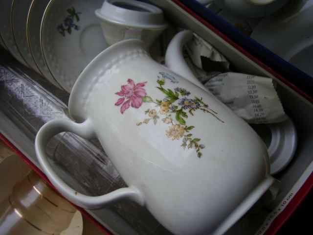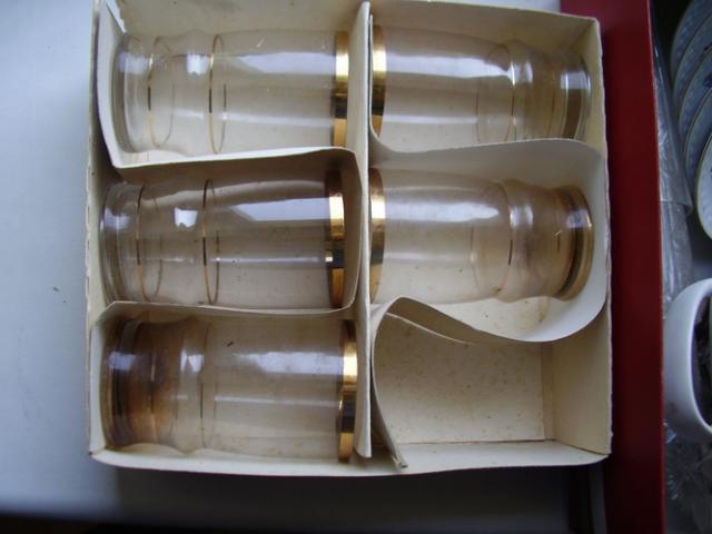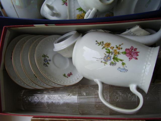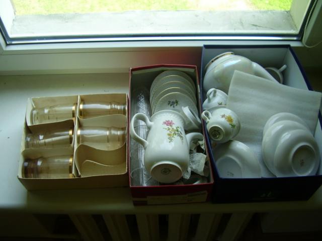15 Senoviniu arbatiniu puoduku (mazu), 9 senovines stiklines, 11lekstuciu(mazu) arbatiniams puodukams, 2 arbatines(tos is kuriu arbata pilsto) ir 1 cukrine :)