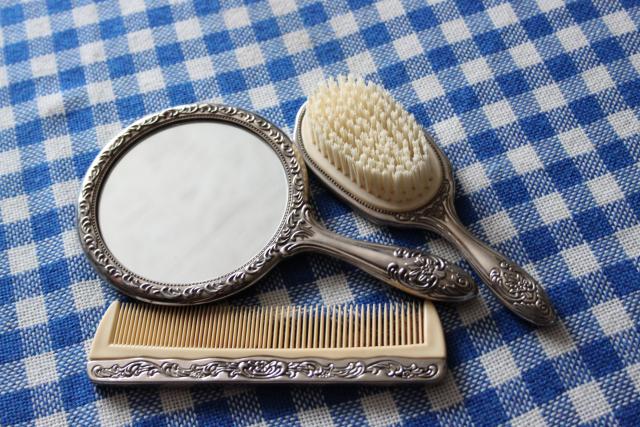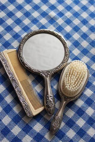 Puikus veidrodėlis, šukos ir šepetys. Pagrindas iš sendinto metalo.