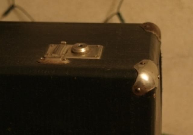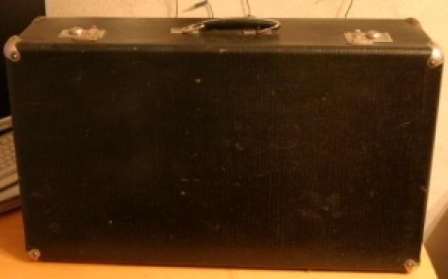 Juodas, didelis, kaustytas. (apkaustai vietomis siek tiek aprudije, bei viena lagamino puse apibraizyta)