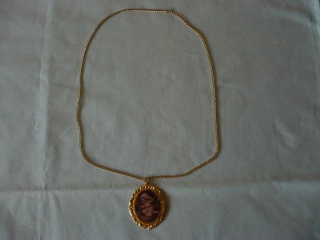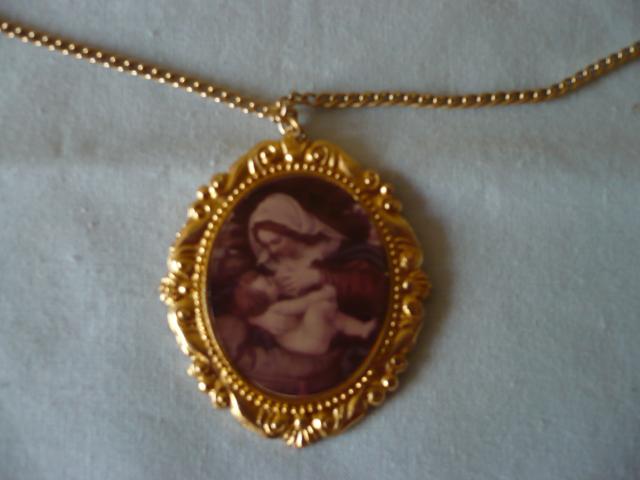 Senoviškas medalionas "Madona su kūdikiu". Geltono metalo, plotis 4,5 cm, aukštis 5,5 cm; paveikslėlis —popierinė, blizgi nuotrauka, nežymiai paeižėjusi, beveik nepastebima tik tam tikru kampu pasukus į šviesą vos matosi. Grandinėlės ilgis 35*2 cm