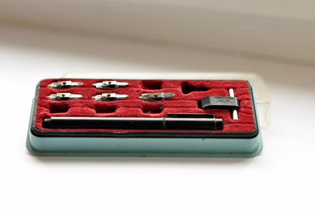 Rasalu rasyti skirtas plunksnakotis. Ankstyvojo sovietinio laikotarpio metu.Viskas veikia gerai, taciau nera keliu pritvirtinamu plunksnu ir iskiles dangtelis (sie defektai matosi nuotraukoje).