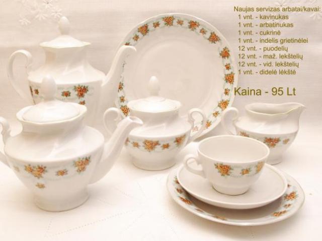 1 vnt. kavinukas, 1 vnt. arbatinukas, 1 vnt. cukrinė, 1 vnt. indelis grietinėlei, 12 vnt. puodelių, 12 vnt. maž. lėkštelės, 12 vnt. vid. lėkštelės, 1 vnt. didelė lėkštė Viso servizo 50 vnt. dalių