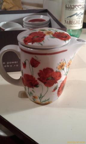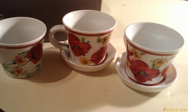 Kavos servizas. Ieina 8 mazi puodeliai su lekstutem ir kavinukas. Dekoruoti aguonu ziedu paveiksliukais.
