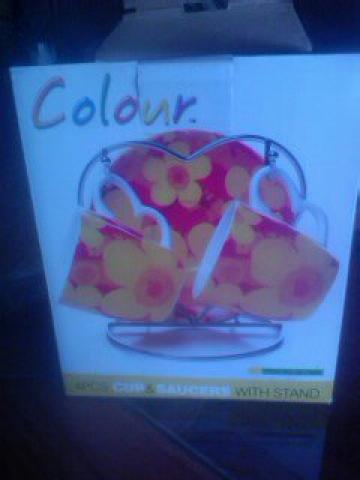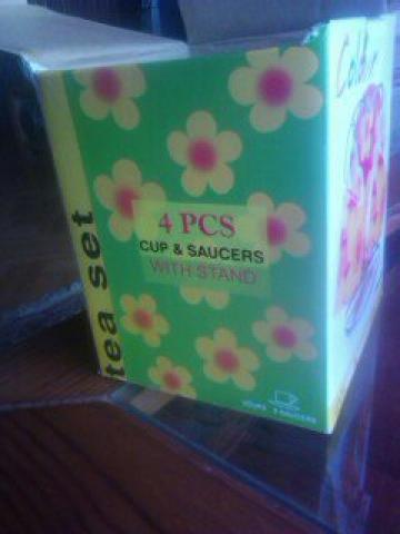 Keturiu daliu serviziukas: du puodeliai ir dvi lekstutes. Yra stovas. Visiskai nauji, is serijos ,,nepanaudotos dovanos" :) siuntimas kainuotu papildomai.