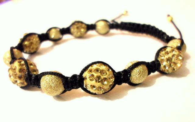 Sudėtis Aukso spalvos, aukštos kokybės Shamballa Disco Ball, polimimerinio molio karoliukas su kristalais 10 mm. Aukso spalvos dulkelių paviršiaus metaliniai karoliukai. Shambala virvelė. Spalva juoda, aukso. Dydis universalus