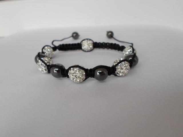 Sudėtis Baltos spalvos, aukštos kokybės, Shamballa Disco Ball, polimimerinio molio karoliukas su kristalais 10mm. Hematitas - labai stiprus magiškas akmuo, kuris yra naudajamas Shamballos apyrankių gamyboje. Jis saugo savo šeimininką nuo pykčio ir neapgalvotų sprendimų, padeda kaupti ir teisingai naudoti energiją. Shamballa virvellė. Spalva juoda, balta Dydis universalus