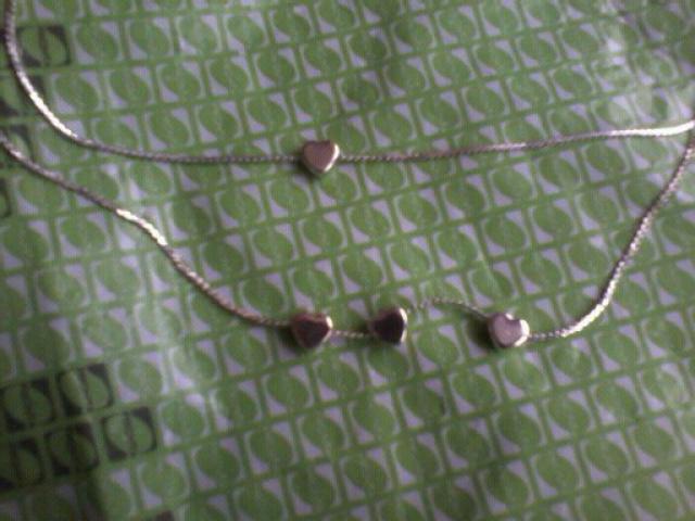 Sidabrinė grandinėlė iš dvieju daliu. Vienoje dalyje tys širdutės, o kitoje viena. VIskas matosi nuotraukoje