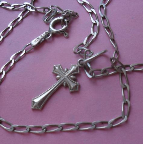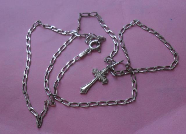 Sidabrinė grandinėlė su kryžiuku gražaus rašto. Yra mažas defektukas, pasilanksčiusi prie užsegimo, bet nešiojant visai nesimato . Jei,kas domina-klauskite