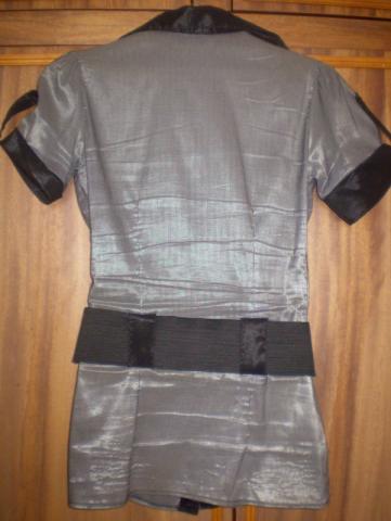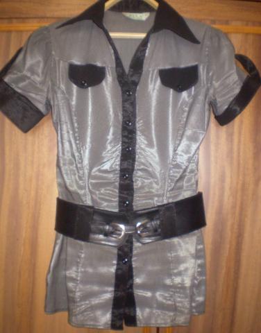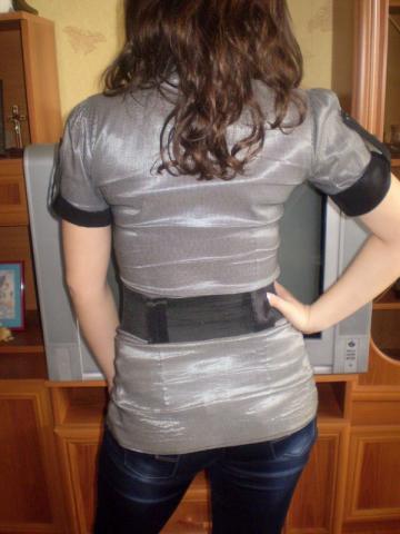 Sidabrinės spalvos marškinukai trumpomis rankovėmis, gan puošnūs, + DIRŽAS.