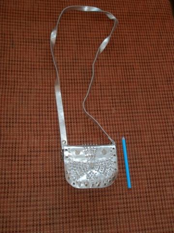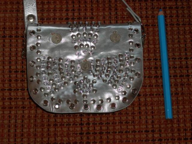 mažas sidabrinis rankinukas ilga rankena, papuoštas "monetom" ir blizgančiais akmenukais.