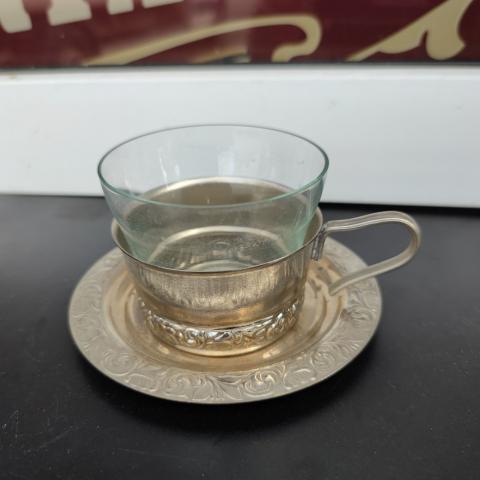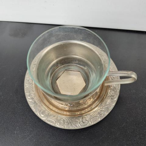 Sidabruota lėkštutė ir stiklinukė su laikikliu.
