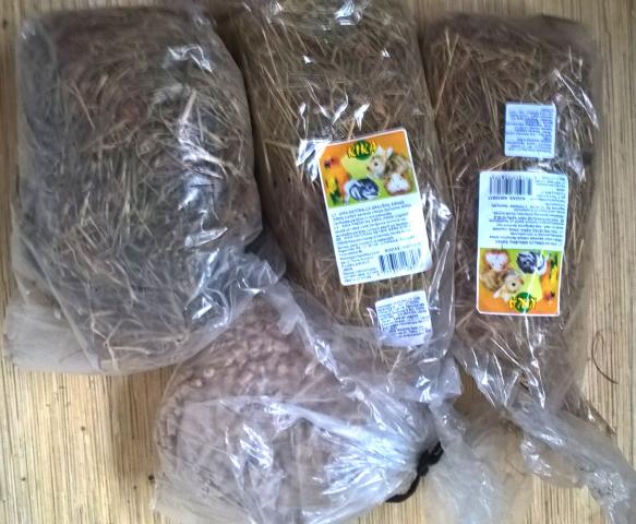 Trys pradėti pakeliai šieno ir granulių maišiukas (pradėtas). Už viską - 1.50 eu.