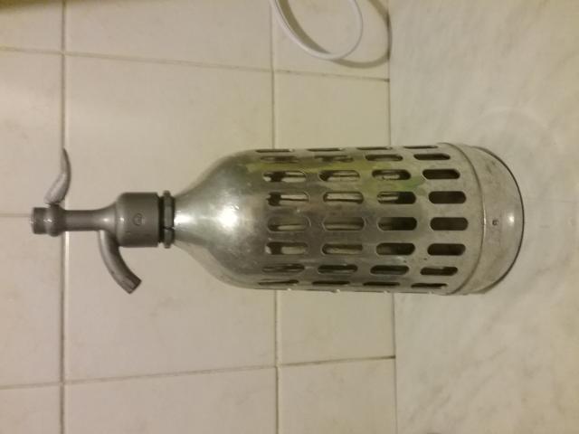 Stiklinis gazuoto vandens sifonas su aliuminiu rėmų.
