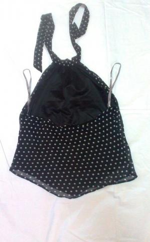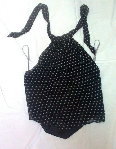 Labai daili, per kaklą susirišanti palaidinė su baltais žirneliais. Geros kokybės, beveik nenešiota. Be iškirptės, tačiau atvira nugara :) Nuotraukose yra iš priekio, šono ir nugaros :)