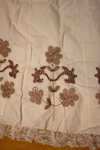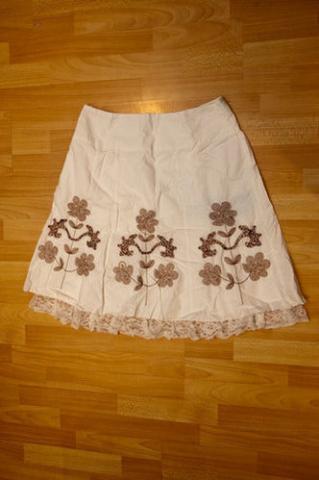 Dramblio kaulo spalvos vasarinis sijonukas, su pamušalu. Išsiuvinėtos gėlės, žvinėliai. Gale - be tiesiog baltas :)