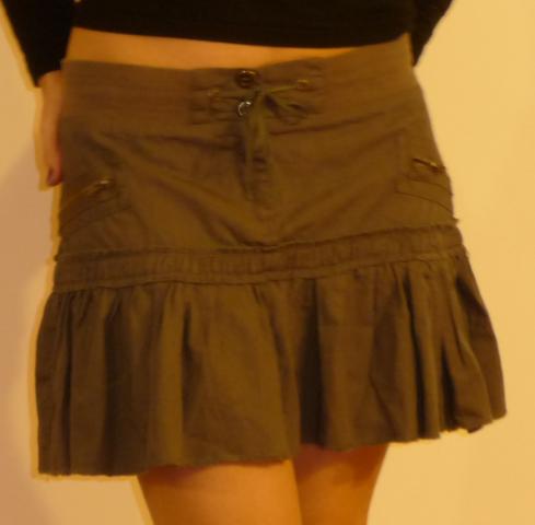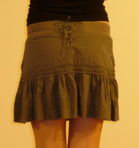 Trumpas, smagus sijonukas. Liemens apimtį galima reguliuoti raišteliais.