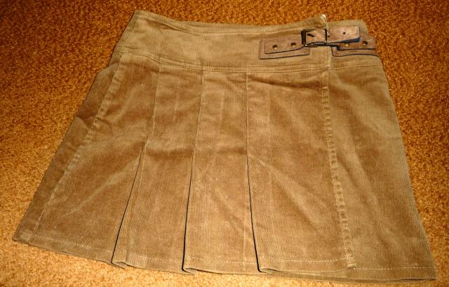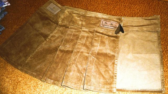 Šiltos rudos spalvos, velveto sijonėlis, originaliai pasiūtas; ilga 94 cm.paklodėlė su užsegimu,matuota per liemenį. Apatine paklotėlė gerokai platesnė ir klostyta.