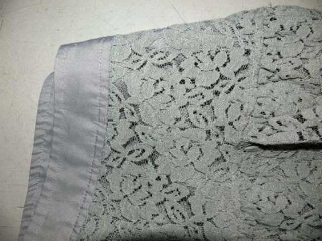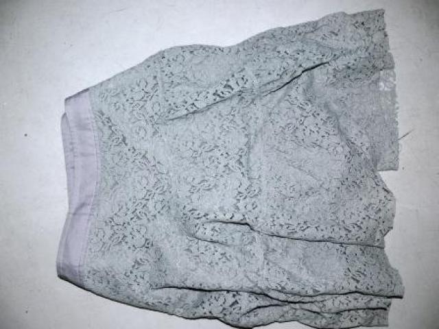 Pilkos spalvos sijonukas . Virsuje plona , rastota medziaga . Yra pasijonis .
