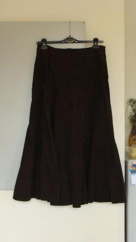 tamsiai rudas, ilgas, smulkaus velveto, geros kokybės sijonas beveik visai nenešiotas:) dydis UK 8 bet manau tiktų ir M nes mano dydis S o man jis platokas,,,