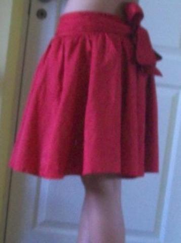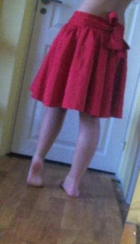 raudonas su juodais mazais taskuciais sijonukas, pustas, su daug pasijonuku, medziaga siek tiek blizganti, nugaroje susirisa kaspinelis.