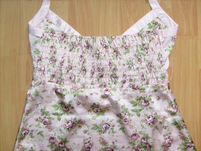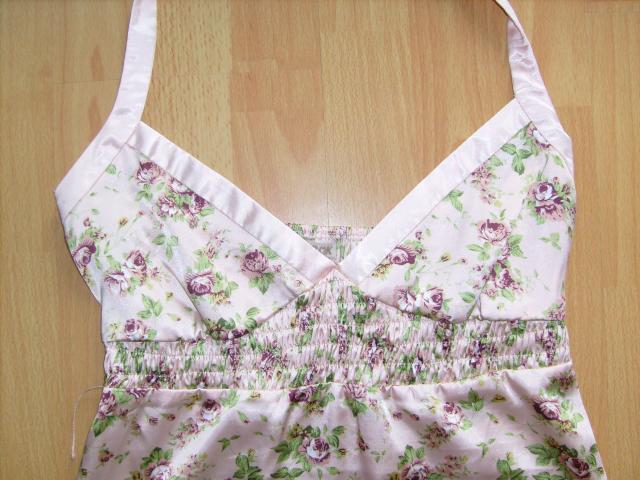 Lengvai krentanti šilkinė palaidinė, maloni prie kūno, susiriša per kaklą. Palaidinės spalva švelni, kreminė, puošta gėlėmis.