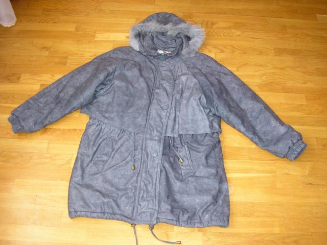 Šilta striukė su gobtuvu (kapisonu). Krutines apimtis 2x64cm, plotis ties liemeniu ir apaciosje 2x61cm, ties liemeniu galima sutraukti (sumazinti). Ilgis 88cm Rankoves ilgis nuo pazasties 48cm.