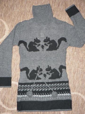 Labai graži, megzta ir šilta, nes turi 20 % vilnos suknelė-tunika. 70% akrilas, 20% vilna, 10% elite. Rašo 152 cm ūgiui. Rankovė nuo peties 50 cm, nuo pažasties 42 cm, pečiai 35 cm, ties krūtine 37 cm, bei visas ilgis 69 cm. Rankoves galima nešioti ir atlenktas, jei ilgokos (mes taip darėm). Defektų tokių nėra, tik kažkiek pasibumbuliavęs, tačiau su pūkų nuėmikliu nurinksiu bumbuliukus. Megzta, šilta, gerai tamposi.