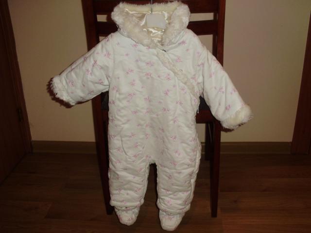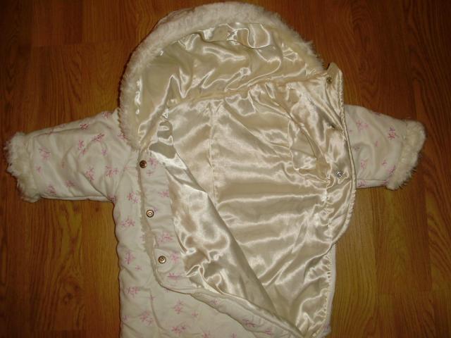Gražus kombinezonas (6-9 mėn.), tinkantis vėlyvam rudeniui, arba ankstyvam pavasariui. Taptikai nusiima. Viršus pagražintas dirbtinu kailiuku. Išmatavimai: Ilgis (nuo viršaus iki apačios) - 58 cm, plotis - 68 cm, rankovės ilgis - 23 cm.