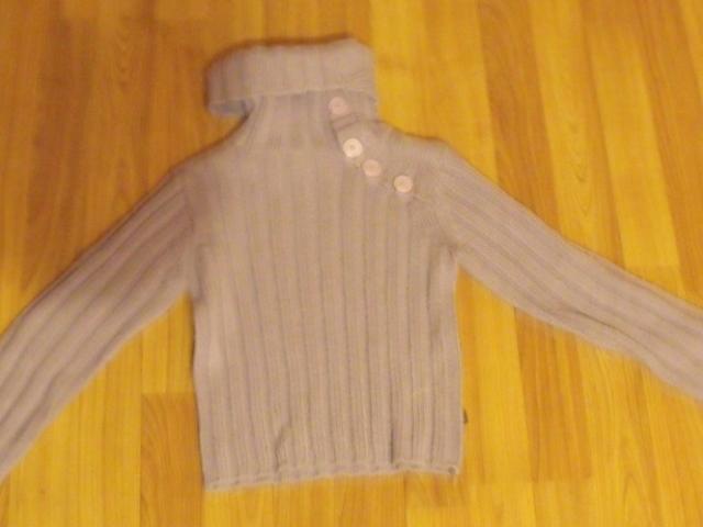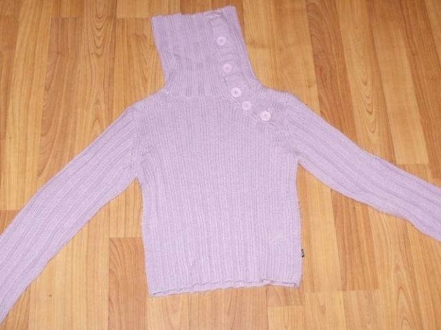 Šiltas , trumpas violetinis megztukas. Apykaklė- labai didelė ir plati, ją galima įv nešioti arba pasistatyti arba užlenkti. Dydis XS- S, skirtas lieknai, neaukštai panelei.