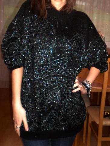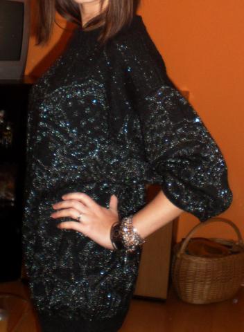 Įdomus, šiltas megztinis, atrodo puošniai, nes yra blizgantis :) Fotografuotas ant XS dydžio, bet tiktų ir S ir M dydžiui, jeigu norite labiau prigludusio :