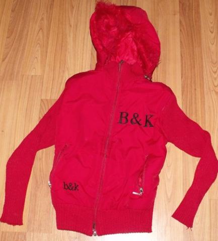 Šiltas raudonas megztukas, rankovės megztos, visą kitą- šiltas pluoštas. Puikiai tinka pavasariui kaip striukytė, yra ir "kapišonas". Dydis S.