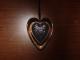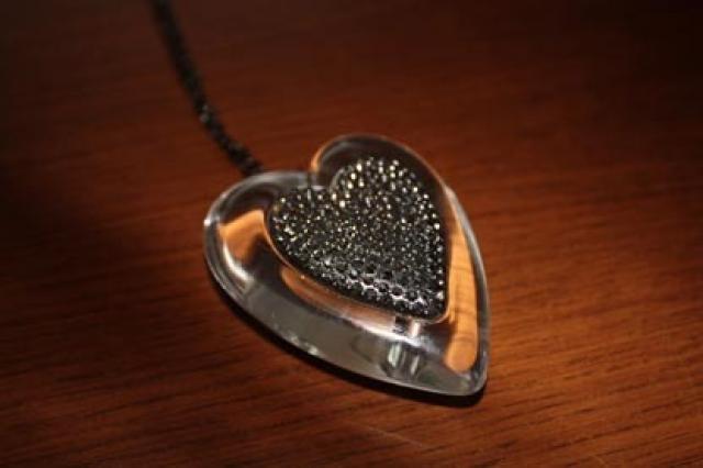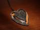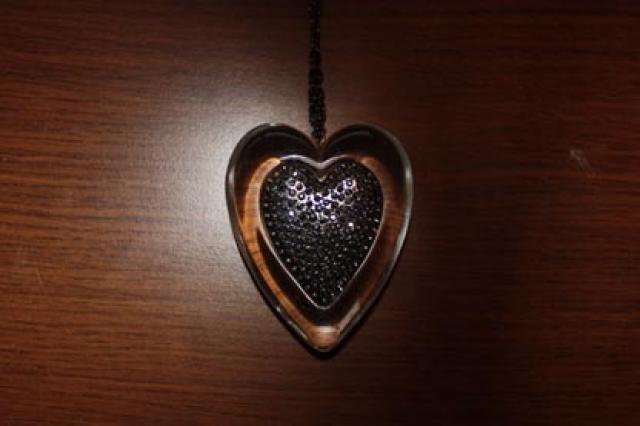 Didelis, masyvus, širdies formos pakabukas. Ant ilgos grandinėlės taigi pati užsidėjus pakabukas nusileidžia kurkas po krūtine. Yra vienas nedidelis įtrūkimas